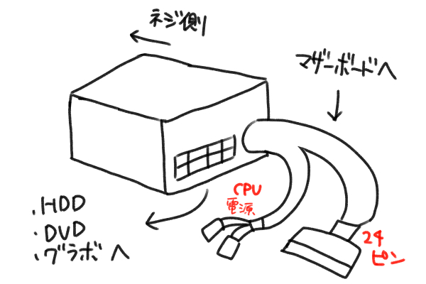 俺は電源マニアになる!というならともかく、どのピンがどういう仕組みかいちいち覚えるのは効率がわるいので、なんとなく「どこに何が刺さっていた」くらいを覚えておけばOK。