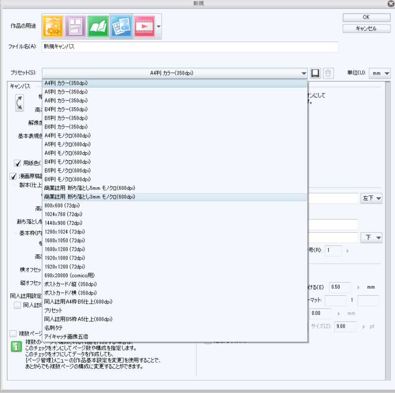 ↑同人誌用で良く使うB5・A5サイズのほか、カラー用・投稿用原稿サイズなども用意されている