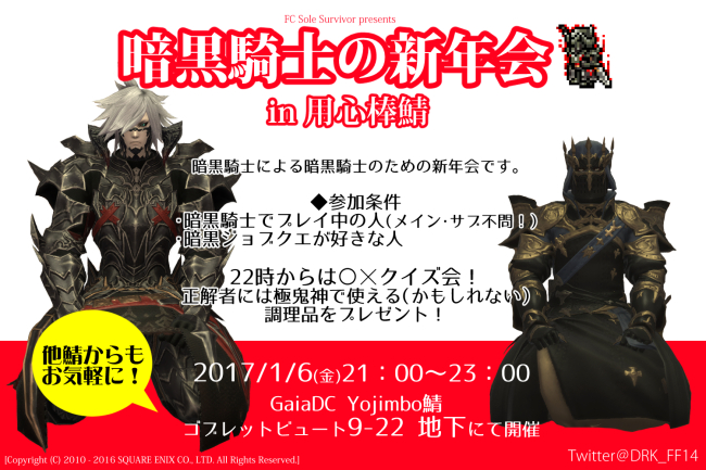 ファイナルファンタジー14のガイアDC、Yojimbo(用心棒)サーバーにて、2017/1/6(金)に開催した「暗黒騎士の新年会」主催によるイベントレポートです。