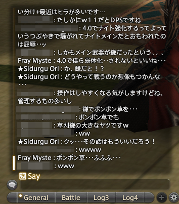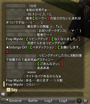 「(白魔の)ホーリーとは戦い」「ブラプラ大事(ブラッドプライス※攻撃を受けてMPを回復する技)」「極女神でバフが足りない」「お祈りダークダンス」といった暗黒騎士ならではの鉄板話題も。