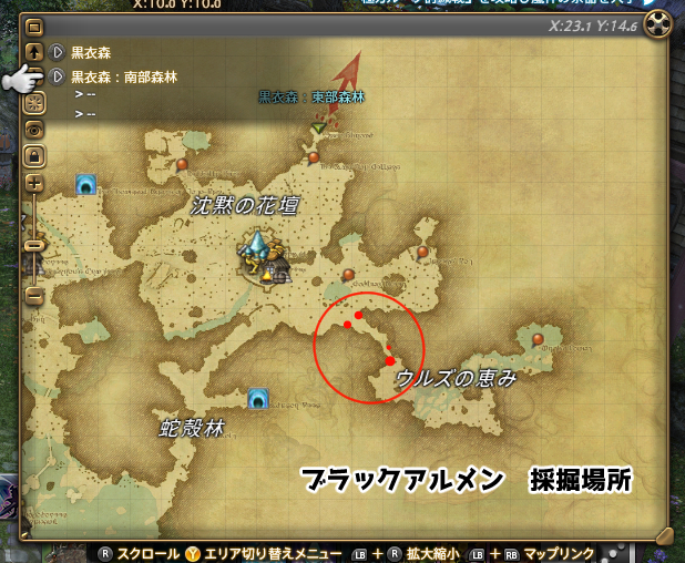 採掘師Lv40 黒衣森 南部森林:ウルズの恵みの入り口付近の採掘場。