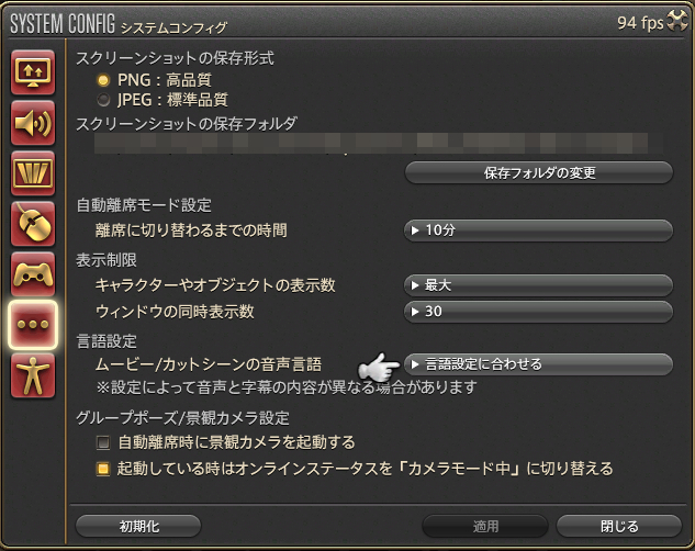 「ムービー/カットシーンの音声言語」を「英語」に変更