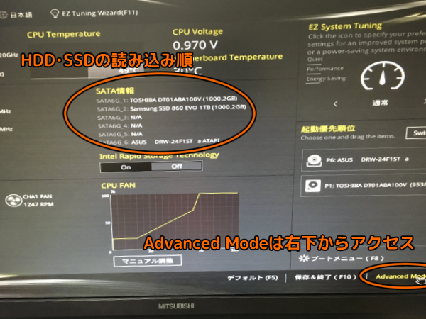 BIOS(UEFI)での読み込み順変更は、G-GEAR製品の場合だと、右下にあるAdvanced Modeで行えます。