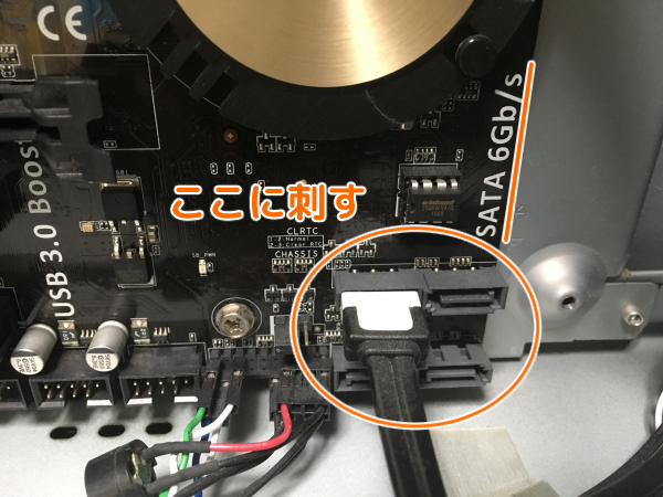 SATAケーブルはマザーボード側にもつなぎます。