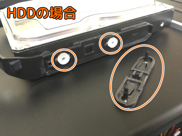 HDDの場合:左右にプラネジ+ゴムパーツがあるのでそれを取り外して台にのせ、もう一度装着する