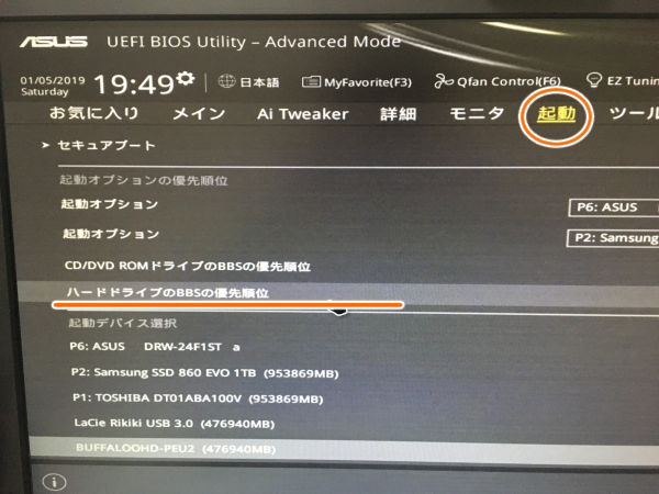 クローンが終わったら一度PCを再起動させ、BIOS(UEFI)画面に入ります。