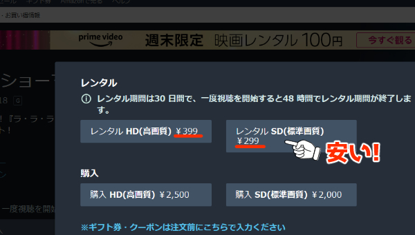 そうです、「HD画質(高画質)」より100円くらい安いんです。
