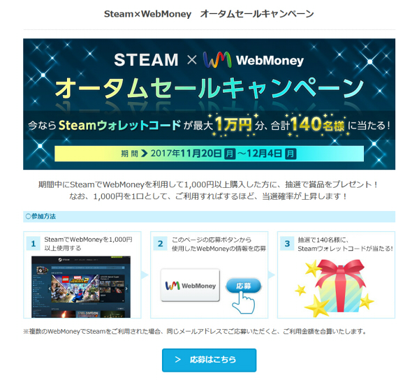 SteamでWebMoney支払いをするとSteamウォレットコードが当たるキャンペーン等もやっているようなので、支払い前にはWebMoney公式サイトのキャンペーンページを覗いておくのをおすすめします。
